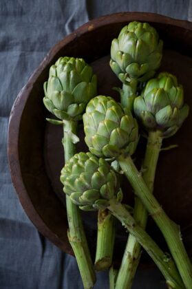 Artichokes widely vary in size and shape, depending on the variety. Thorny artichokes that feels heavy for their size, is an indication of a large edible core. When cooked, the fleshy base of the bracts and the heart are the only portions consumed. The bracts and heart have a green, nutty, and slightly tangy vegetal flavor.