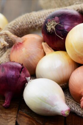 Red onions are small to medium in size. Red onions are crunchy, pungent, sweet, and slightly spicy. The intensity of the pungent flavor varies depending on age, the variety, and the amount of sulfur in the growing soil or the fertilizer used.